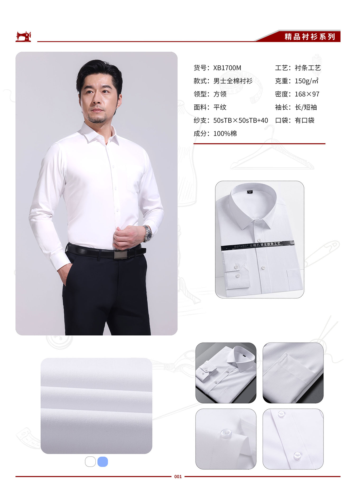 XB1700M 男士80支全棉抗皱衬衫(衬条工艺)