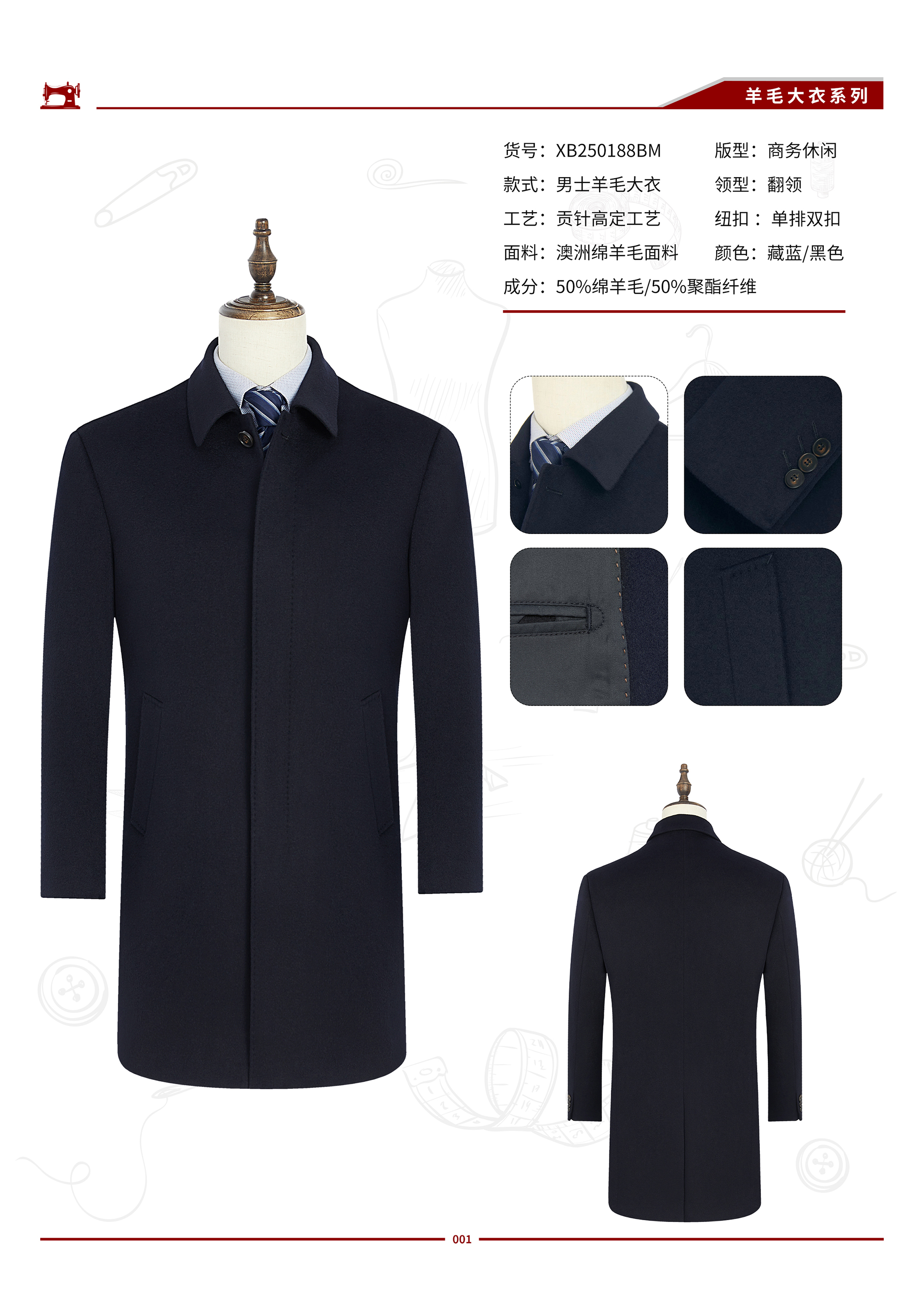 品名 XB25Y0188BM 男士50%羊毛暗扣大衣